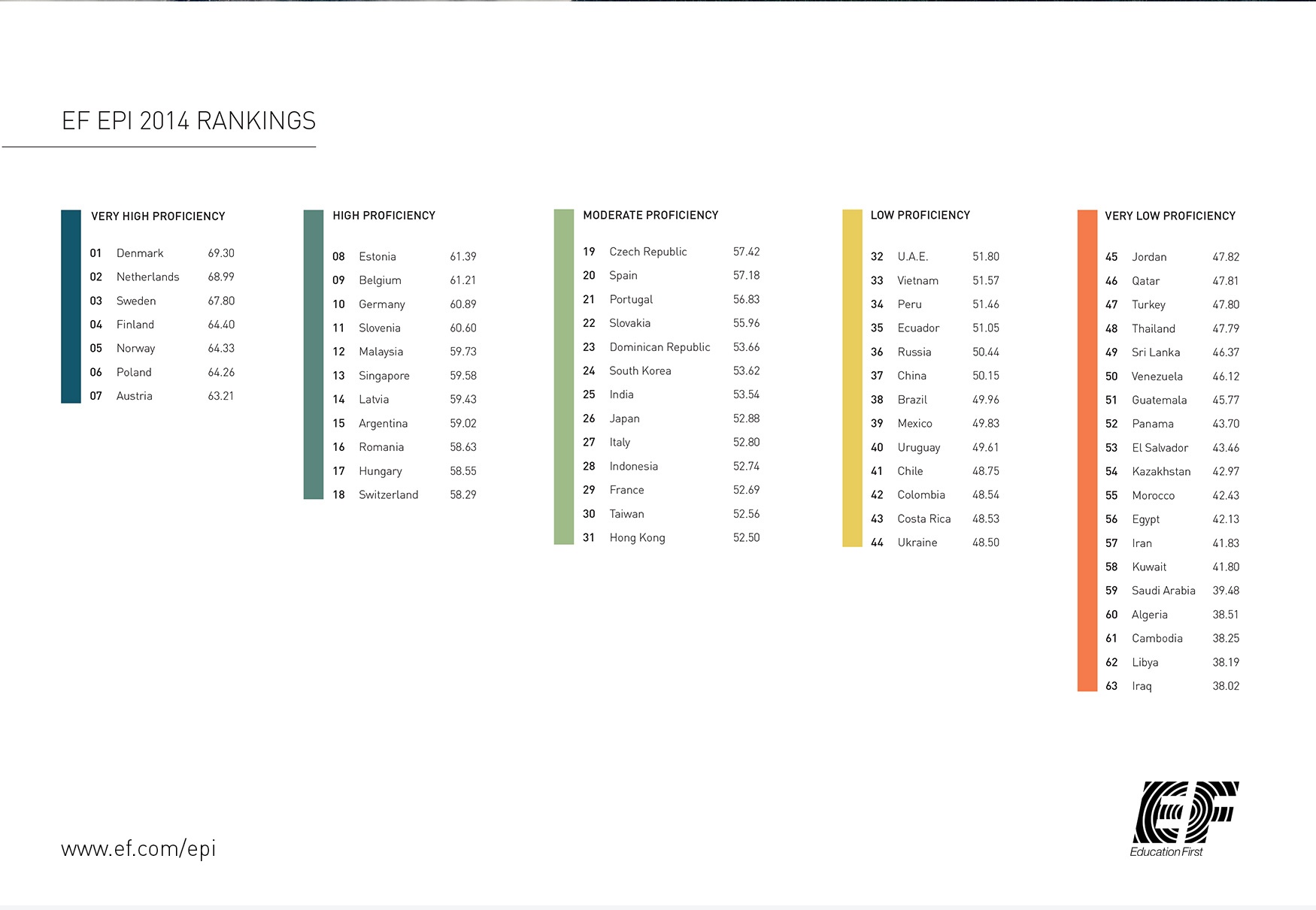 Bảng xếp hạng tổng hợp của các quốc gia về Mức độ thông thạo Anh ngữ EF EPI. |