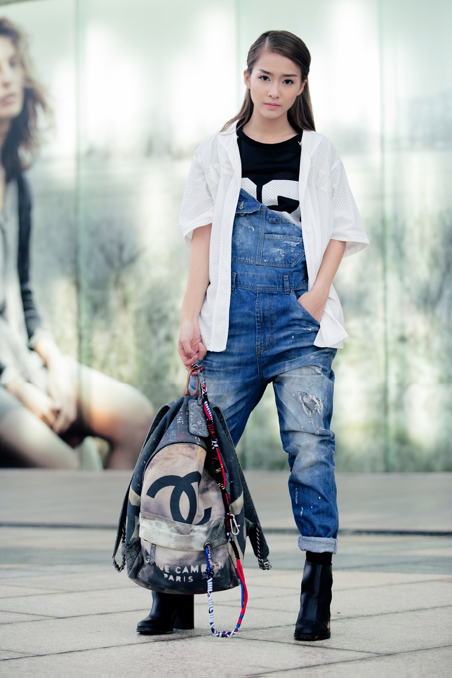 | Với sự hỗ trợ của stylist Travis, cô diện quần yếm jeans bụi phủi, phá cách, kết hợp cùng boots cổ ngắn, áo thun số và áo khoác ngoài chất liệu thể thao mạnh mẽ. Để phù hợp với set đồ đậm chất đường phố, hot girl để kiểu tóc rẽ ngôi, suông thẳng đơn giản. Phụ kiện túi balo cá tính. |