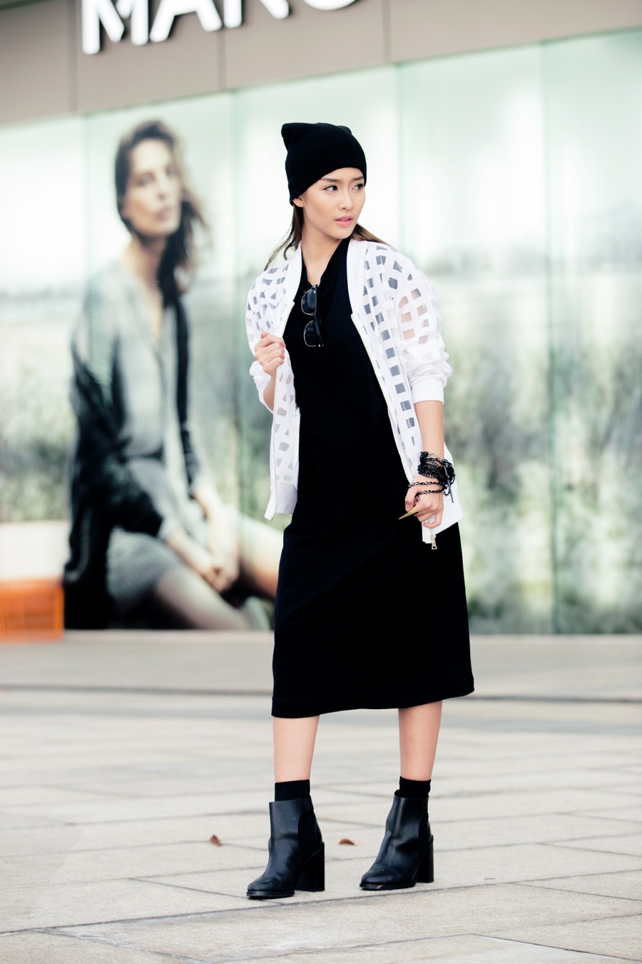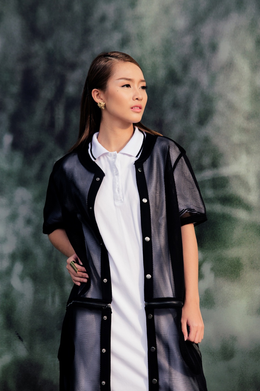 | Duy trì phong cách cá tính, lần này Khả Ngân chọn mốt trắng đen mix ăn ý giữa váy suông và áo lưới hiện đại, đậm phong cách thể thao khỏe khoắn. |