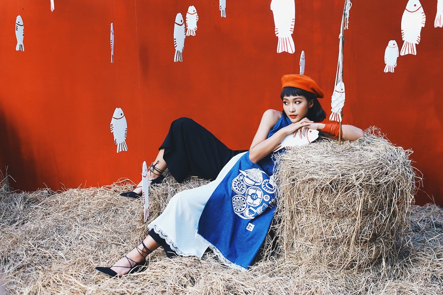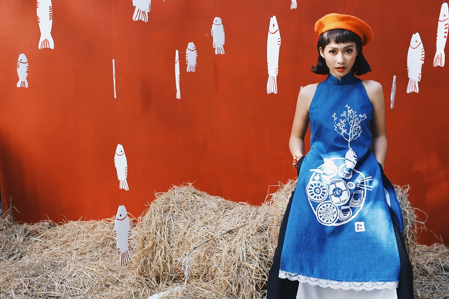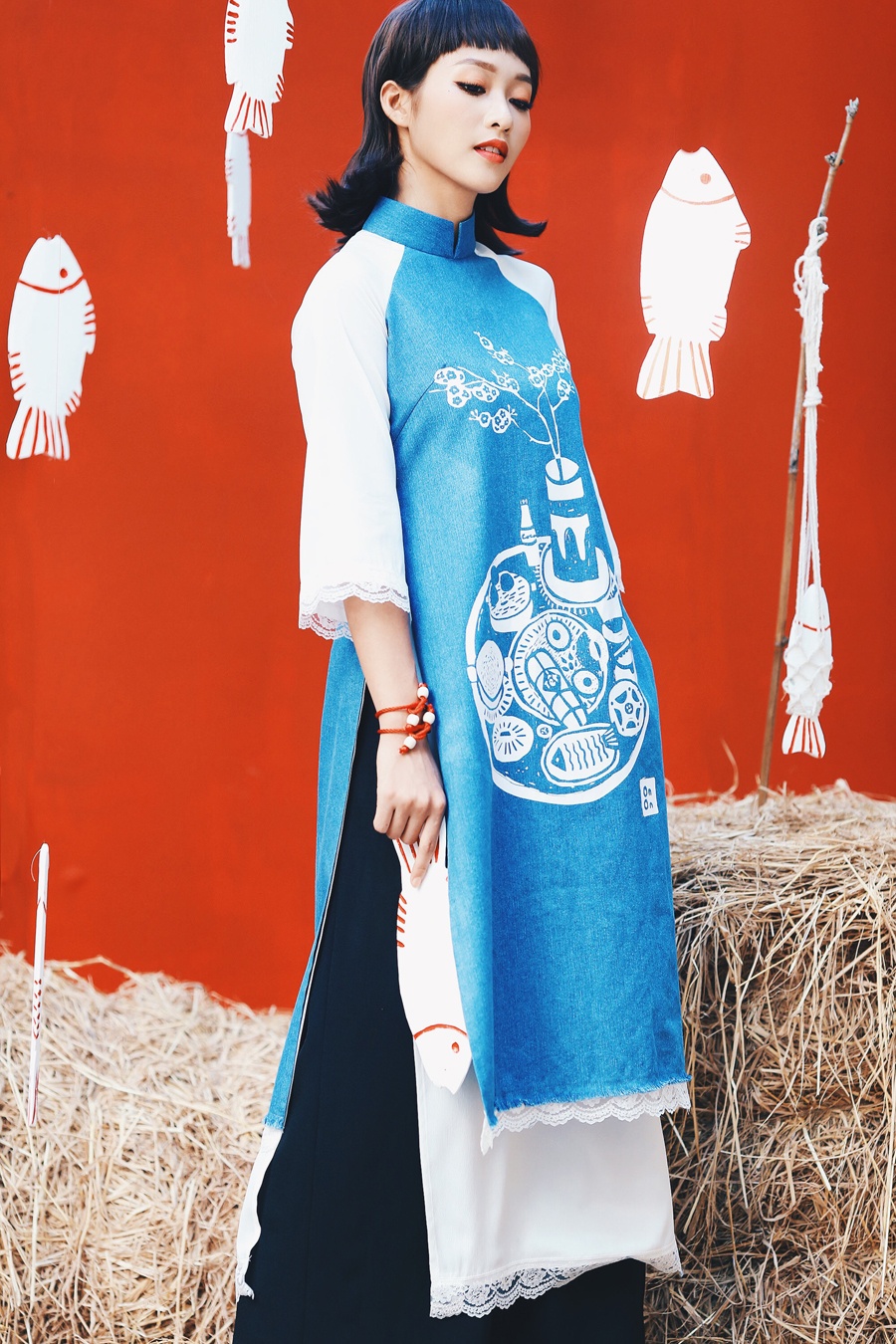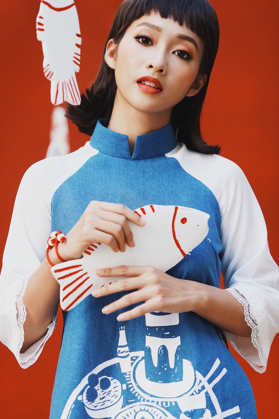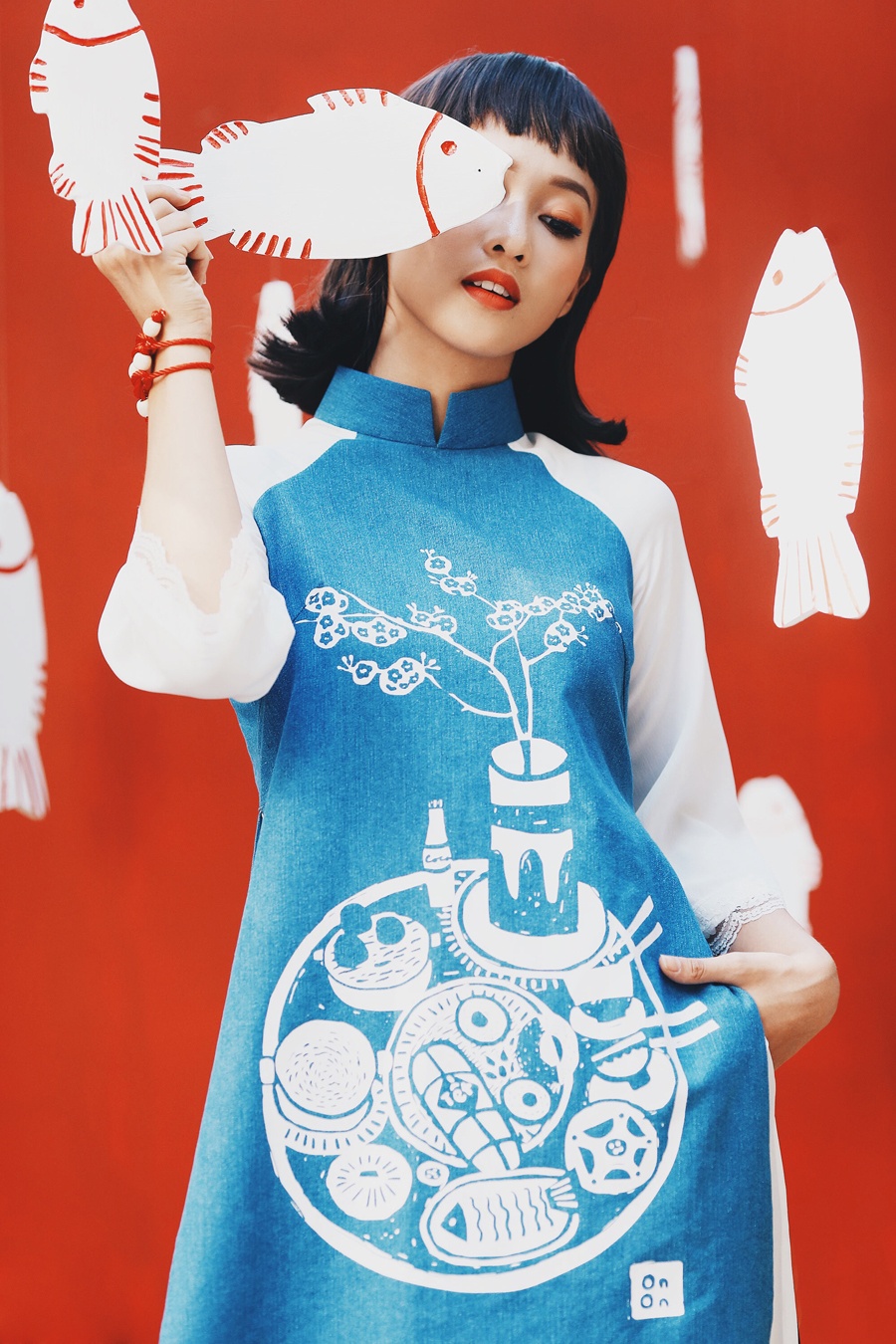 | Trong ảnh, nữ diễn viên 9X diện những thiết kế áo dài cách tân ứng dụng, màu sắc hòa nhã, họa tiết dân gian gần gũi được chuẩn bị bởi stylist Mai Phạm. |