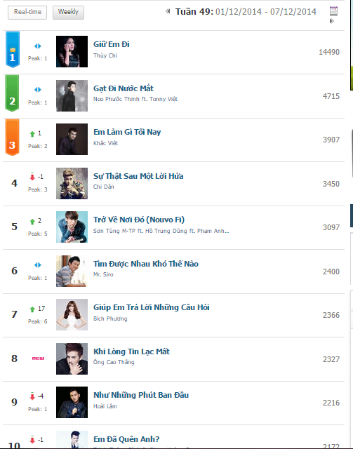 Tại bảng xếp hạng ca khúc không có nhiều xáo trộn như hạng mục MV. Thùy Chi sau khi thay thế Noo Phước Thịnh vẫn đứng vững ở vị trí quán quân suốt 2 tuần liên tiếp. Ở tuần 49, nữ ca sĩ vừa soán ngôi đầu bảng của Noo để đưa ca khúc Giữ em đi lên ngôi đầu và tiếp tục vững chắc ở tuần 50. Sau một thời gian trở lại, Thùy Chi vẫn có sức hút rất lớn với công chúng nghe nhạc. Mặc dù ngoại hình của hiện tượng mạng ngày nào đã có sự thay đổi đáng kể nhưng giọng hát của cô vẫn làm thổn thức người nghe.