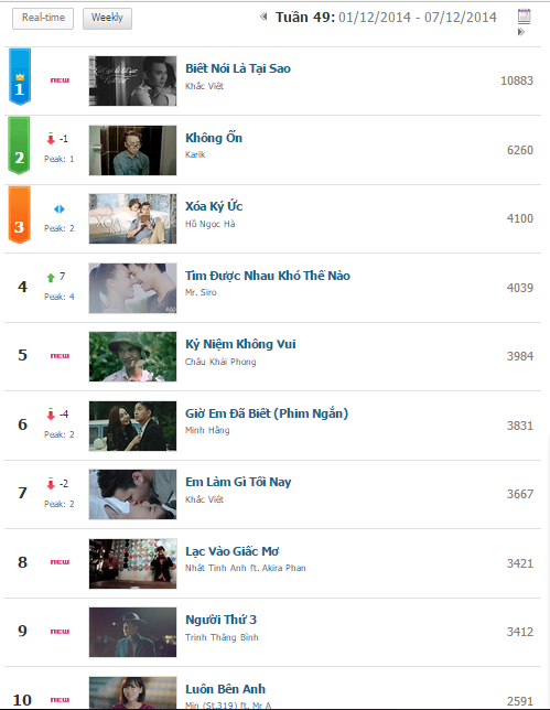 Bảng xếp hạng MV tuần 49 và 50 trong nửa đầu tháng 12. |