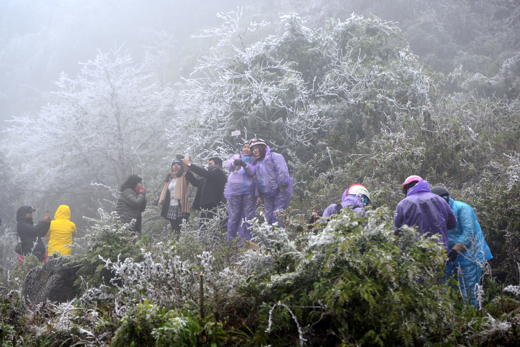 | Sáng 17/12, đỉnh Ô Quy Hồ tràn ngập cảnh băng bao phủ. Hai bên đường xuất hiện nhiều người từ thị trấn Sapa đi ôtô, xe máy lên chụp ảnh. |