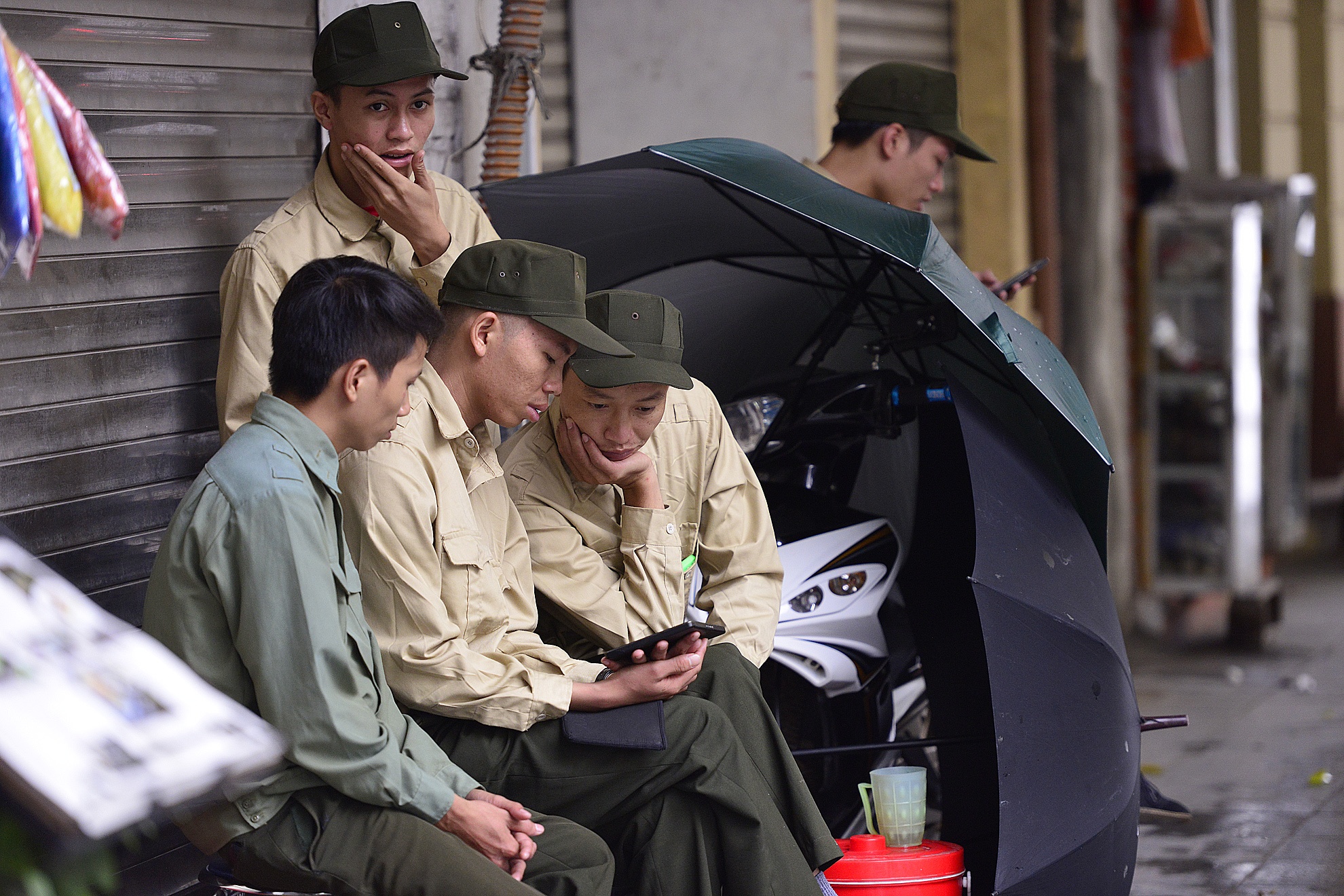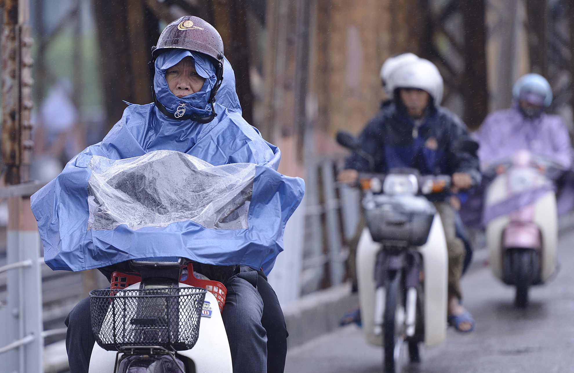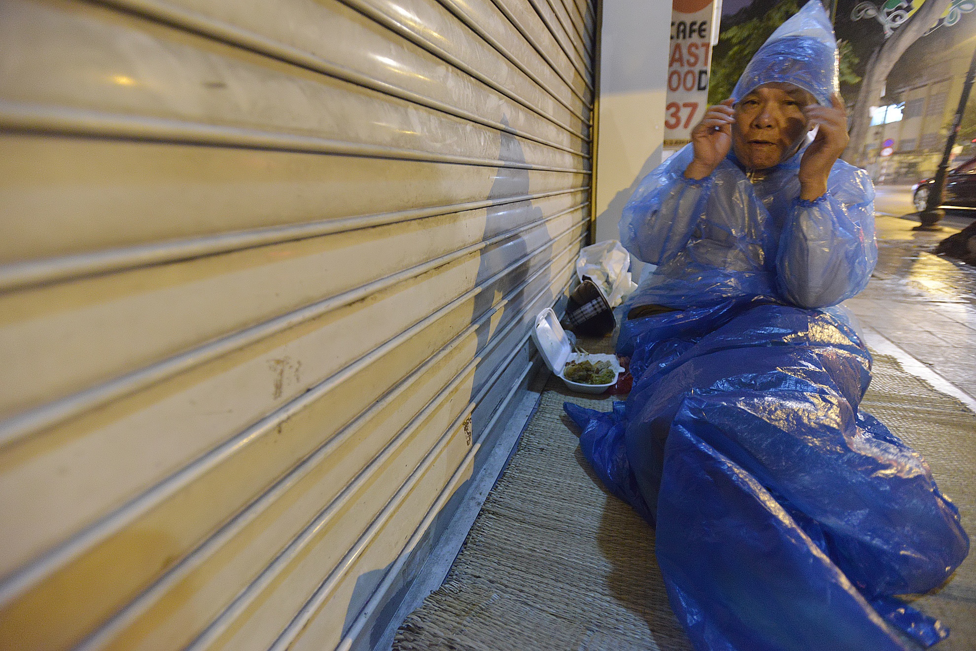Thời tiết rét buốt kèm mưa lạnh khiến nhiệt độ ở thủ đô hạ thấp. Một số người phải mặc áo mưa để chống giá lạnh đầu mùa khi ngủ hoặc ngồi nghỉ trên vỉa hè.