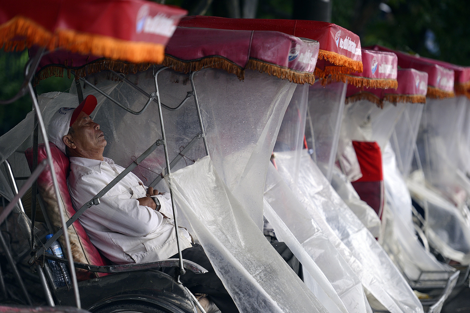 | Đội xích lô dùng áo mưa che chắn để chống gió. Có người còn khoanh tay ngủ luôn trên xe. |