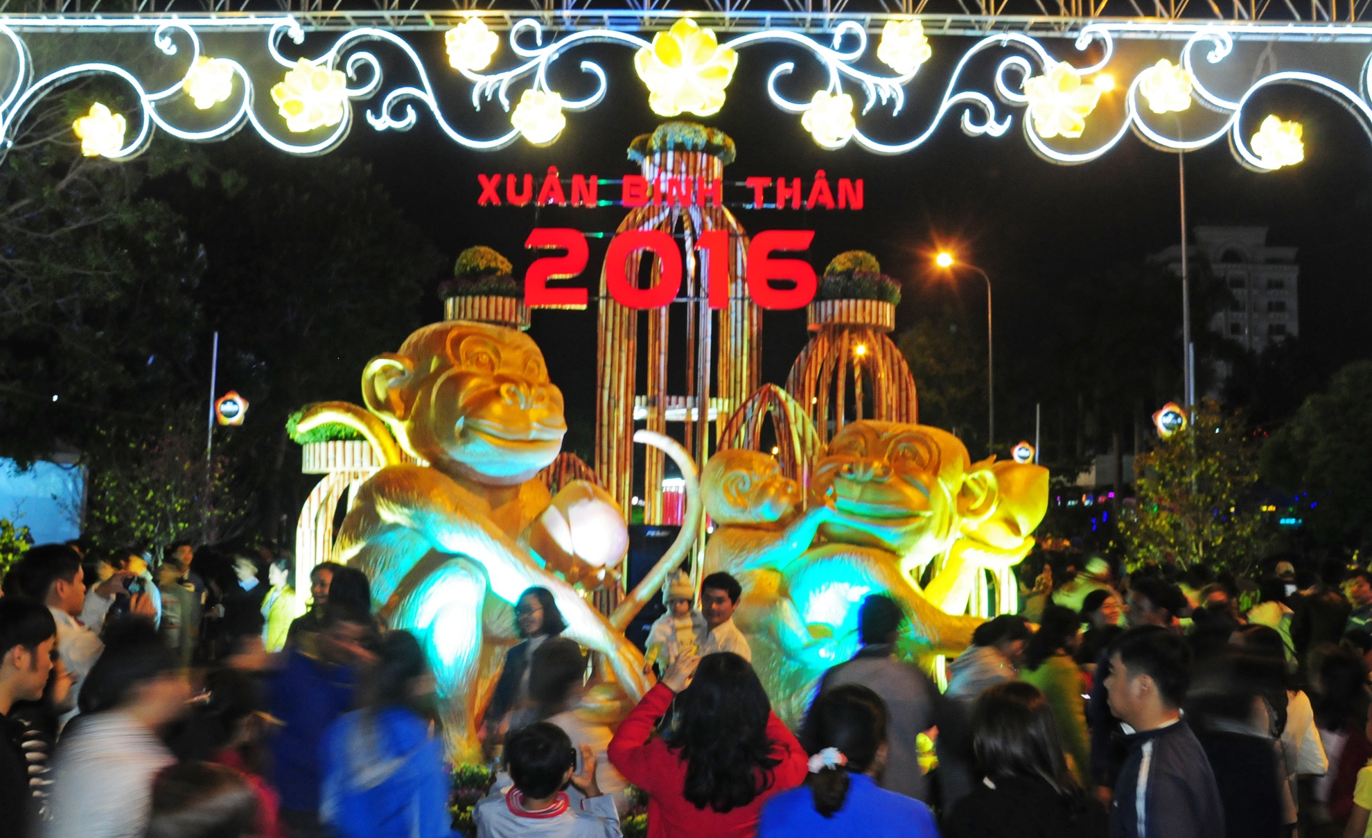| Sau một tháng thi công, tối 5/2, đường hoa thanh niên mang chủ đề "Mùa xuân và tuổi trẻ" mừng đón Tết Bính Thân - 2016 khai mạc, mở cửa cho công chúng thưởng ngoạn. Đông đảo du khách ghi lại kỷ niệm đẹp bên "đảo linh vật" với gia đình khỉ nô đùa trên thảm hoa. |