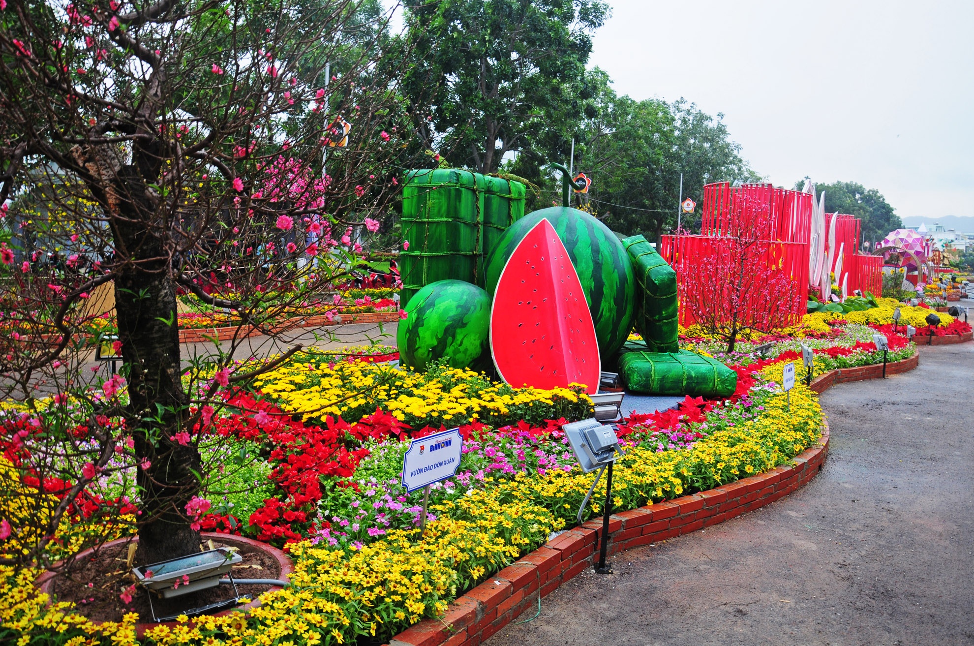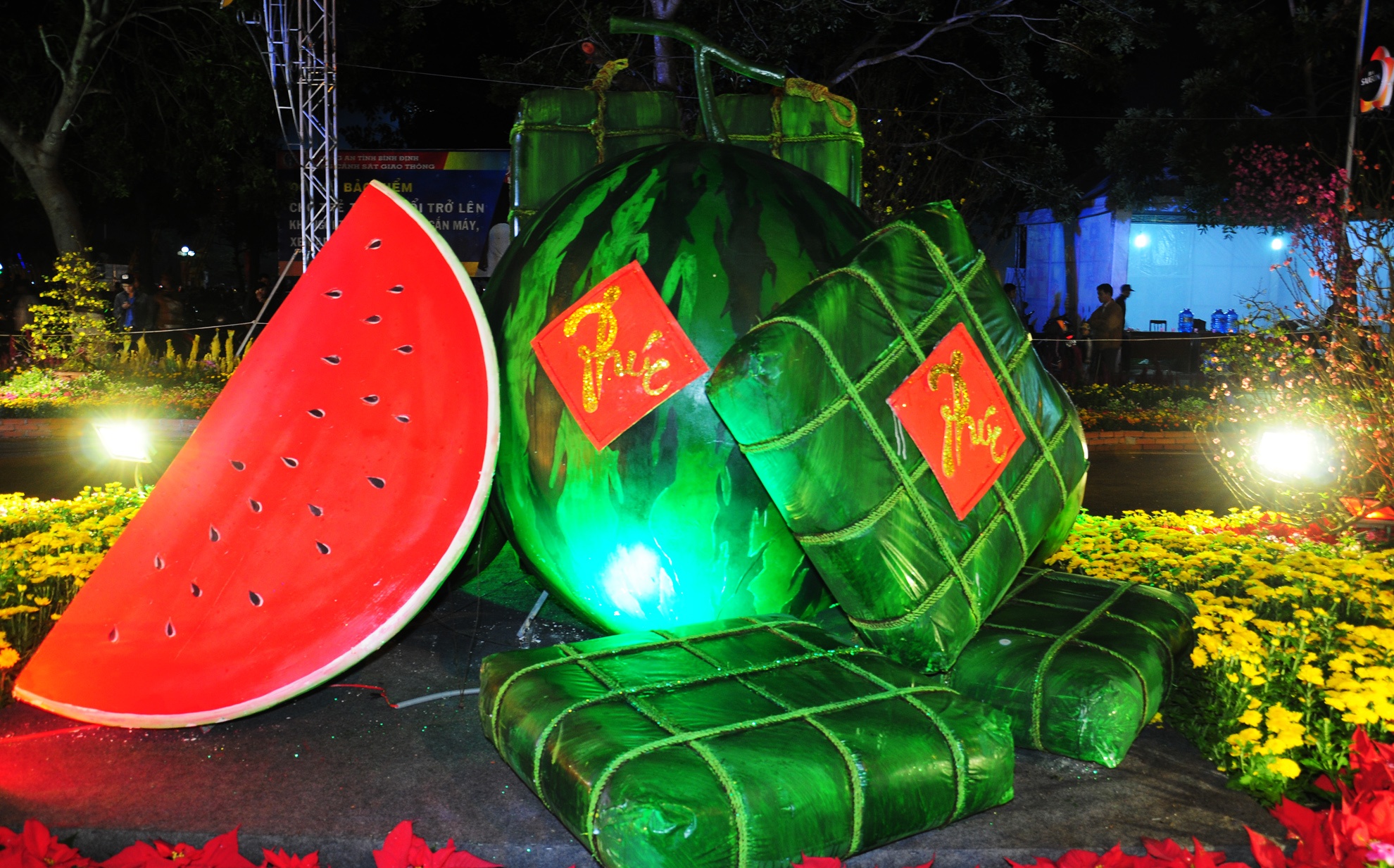| Mô hình dưa hấu đỏ, bánh chưng xanh. Ban tổ chức gửi lời chúc phúc đến người dân cùng du khách. Bí thư Tỉnh đoàn Bình Định Nguyễn Minh Triết hy vọng, đây là công trình ý nghĩa, hứa hẹn sẽ trở thành điểm vui chơi, sinh hoạt văn hóa lành mạnh cho người dân cùng du khách khi đến với tỉnh Bình Định dịp đầu năm mới. |