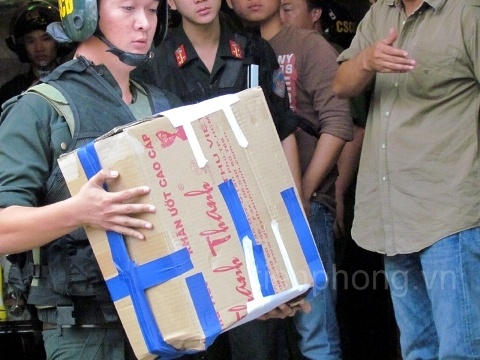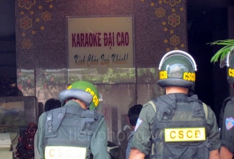 | Từ 12 giờ đến 15 giờ 15 ngày 26/10, cơ quan cảnh sát điều tra công an Khánh Hòa đã đồng loạt khám xét quán karaoke Đại Cao (18C Yết Kiêu, phường Vạn Thắng, Nha Trang, Khánh Hòa) và nhà số 13 đường Chí Linh (phường Phước Hòa, Nha Trang). Hai cơ sở này đều của ông Nguyễn Ng. H.. Trong ảnh là công an lập biên bản khám xét nhà 18C Yết Kiêu, bên cạnh là các tang vật thu giữ |