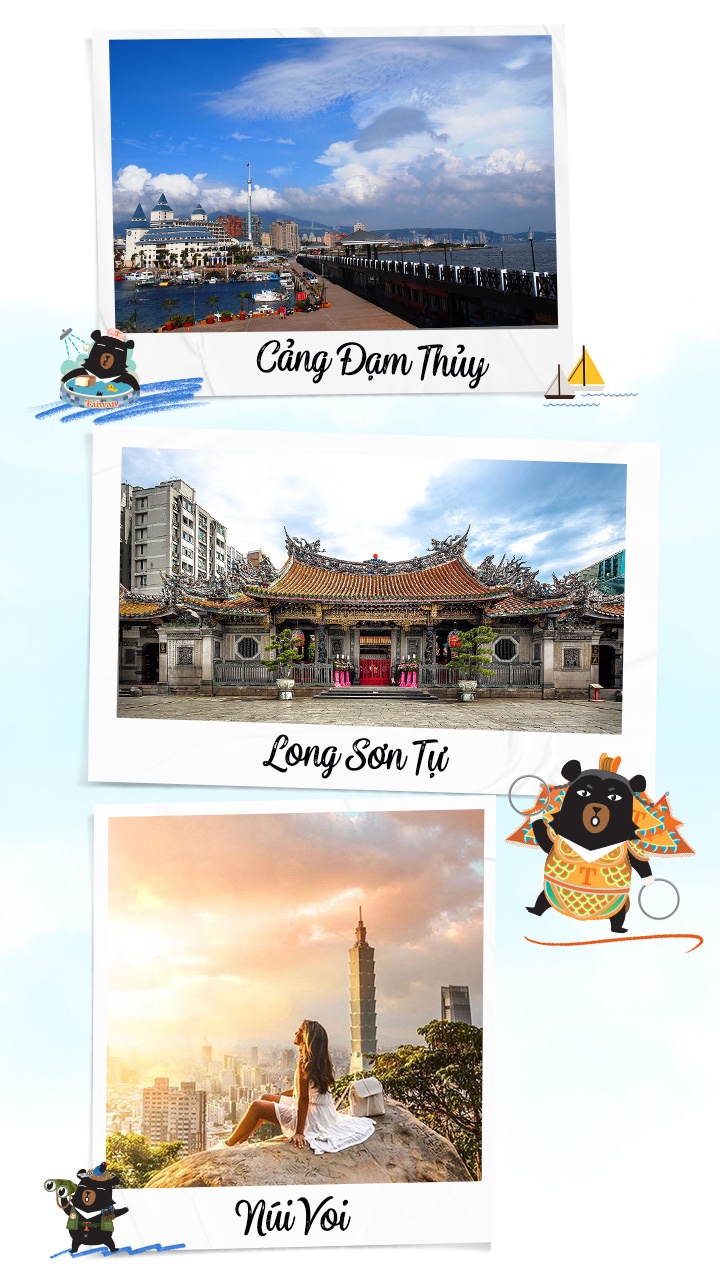 Cảng Đạm Thủy: Đạm Thủy từng là cảng lớn nhất Đài Loan trong thế kỷ 19. Tuy không nổi tiếng như phố cổ Cửu Phần hay Thập Phần, Đạm Thủy vẫn có nét rất riêng để níu chân du khách khi tới thăm. Đến cảng, bạn kết hợp thăm thú những ngôi đền lâu đời, thưởng thức ẩm thực, đi dạo bằng xe đạp hay tận hưởng khung cảnh hoàng hôn lãng mạn.