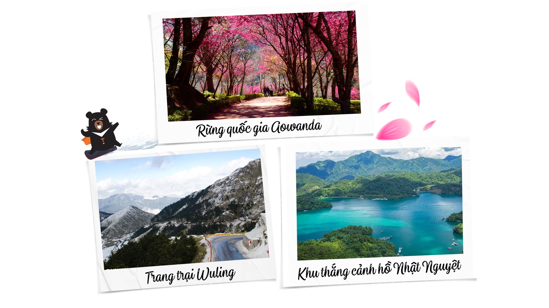 Khu thắng cảnh hồ Nhật Nguyệt: Hồ lớn nhất của Đài Loan có cảnh quan huyền ảo mọi thời điểm trong ngày. Buổi sáng, Nhật Nguyệt chìm trong mờ sương; giữa trưa, mặt hồ trong vắt; chiều đến, hồ nhuốm ánh vàng như chảo lửa khổng lồ. Để cảm nhận khung cảnh yên bình thường nhật, bạn hãy thuê xe và dạo quanh hồ.