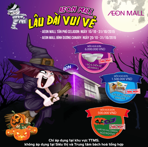 Đặc biệt, hàng loạt ưu đãi hấp dẫn lên đến 50% đến từ rất nhiều thương hiệu nổi tiếng ở tất cả ngành hàng, sản phẩm, dịch vụ chất lượng nhất. Bạn hãy khám phá các bí ẩn ẩn giấu trong lâu đài vui vẻ để có một mùa Halloween vui nhộn, thú vị cùng AEON MALL.