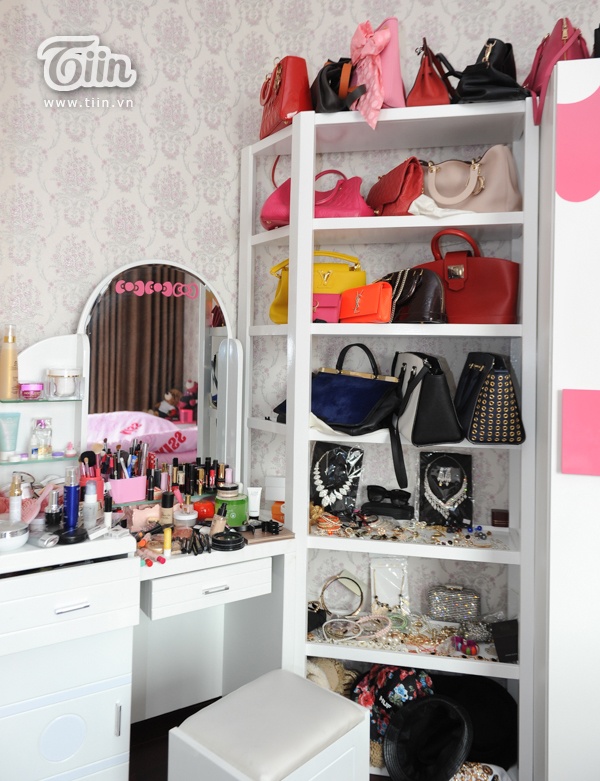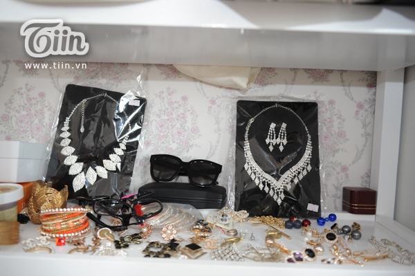 | Góc tủ bày các phụ kiện và mỹ phẩm làm đẹp của Huyền My được xếp gọn gàng. |