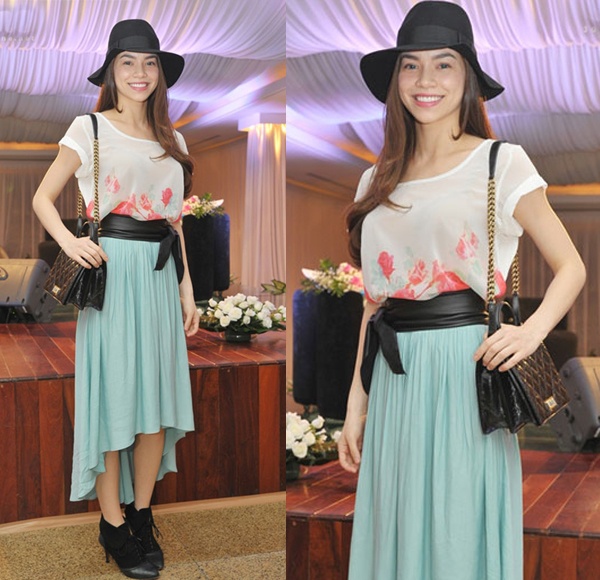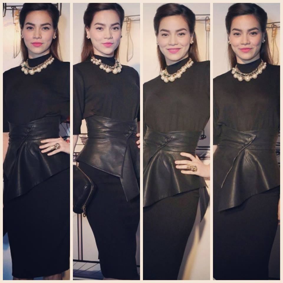 Là người khá cầu toàn, từng chi tiết nhỏ phối cùng trang phục cũng được ‘’Nữ hoàng giải trí’’ lưu tâm. Trong nhiều set đồ cô chú trọng đến phụ kiện hoa tai, giày, túi, thắt lưng… mix rất đồng bộ về đường nét và sắc màu. Đôi khi phụ kiện là điểm nhấn tạo sự cuốn hút cho tổng thể. Sự thành công bắt đầu từ những điều nhỏ nhặt nhất, theo đúng quy tắc này, Hà Hồ trở thành biểu tượng mặc đẹp của showbiz Việt nhờ những điểm nhấn cá tính đi kèm trang phục. Thắt lưng peplum tạo điểm nhấn cá tính cho bộ trang phục tông đen.