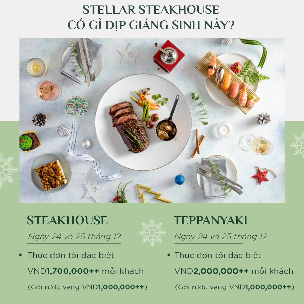 Dừng chân tại Stellar Teppanyaki, điều thu hút nhất đó là màn trình diễn khói lửa mãn nhãn trên nền trời đêm lung linh của thành phố. Sự kết hợp giữa súp miso tôm hùm, tôm đỏ Carabineros và sò điệp Hokkaido rưới sốt bơ chanh, cùng bò Kobe Kamichiku A4 cuộn măng tây và nấm truffle Pháp sẽ khiến Giáng sinh của bất cứ ai bừng sáng, ấm cúng giữa ngày đông giá lạnh. Tất cả đều được đầu tư kỹ lưỡng, hòa hợp với cảm xúc và bầu không khí mùa lễ hội.
