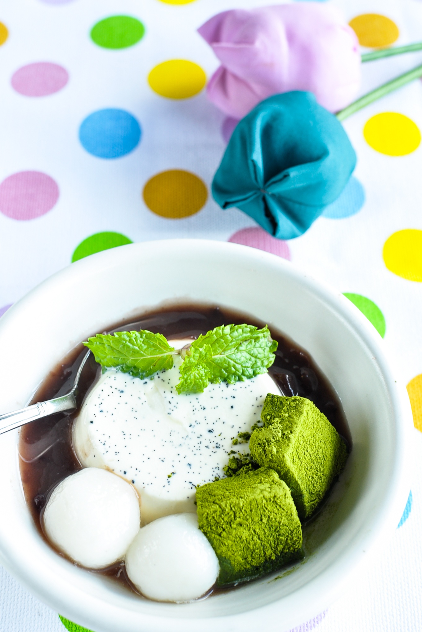 | Panna cotta với sốt đậu đỏ và bánh dày trà xanh. |