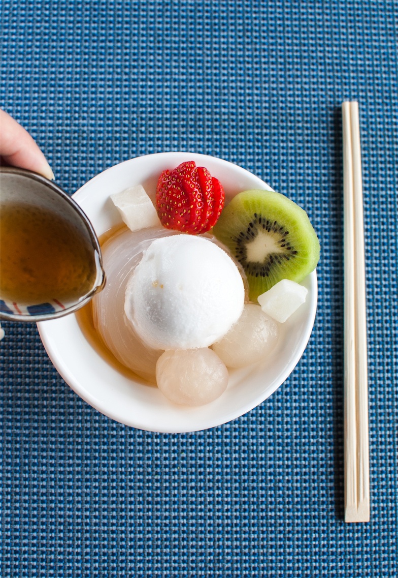 | Tokoroten sợi với kem quýt Nhật, sốt trà Houji và trái cây. |