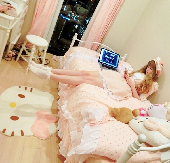 | Phòng ngủ màu hồng ngập tràn gấu bông, phụ kiện lộng lẫy. Cô là tín đồ của hàng công nghệ quả táo. |