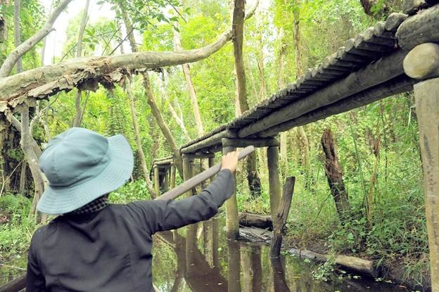 | Các cô du kích, trong những bộ áo bà ba, nón tai bèo chèo xuồng đưa du khách qua những con rạch để thăm di tích Xẻo Quít. |