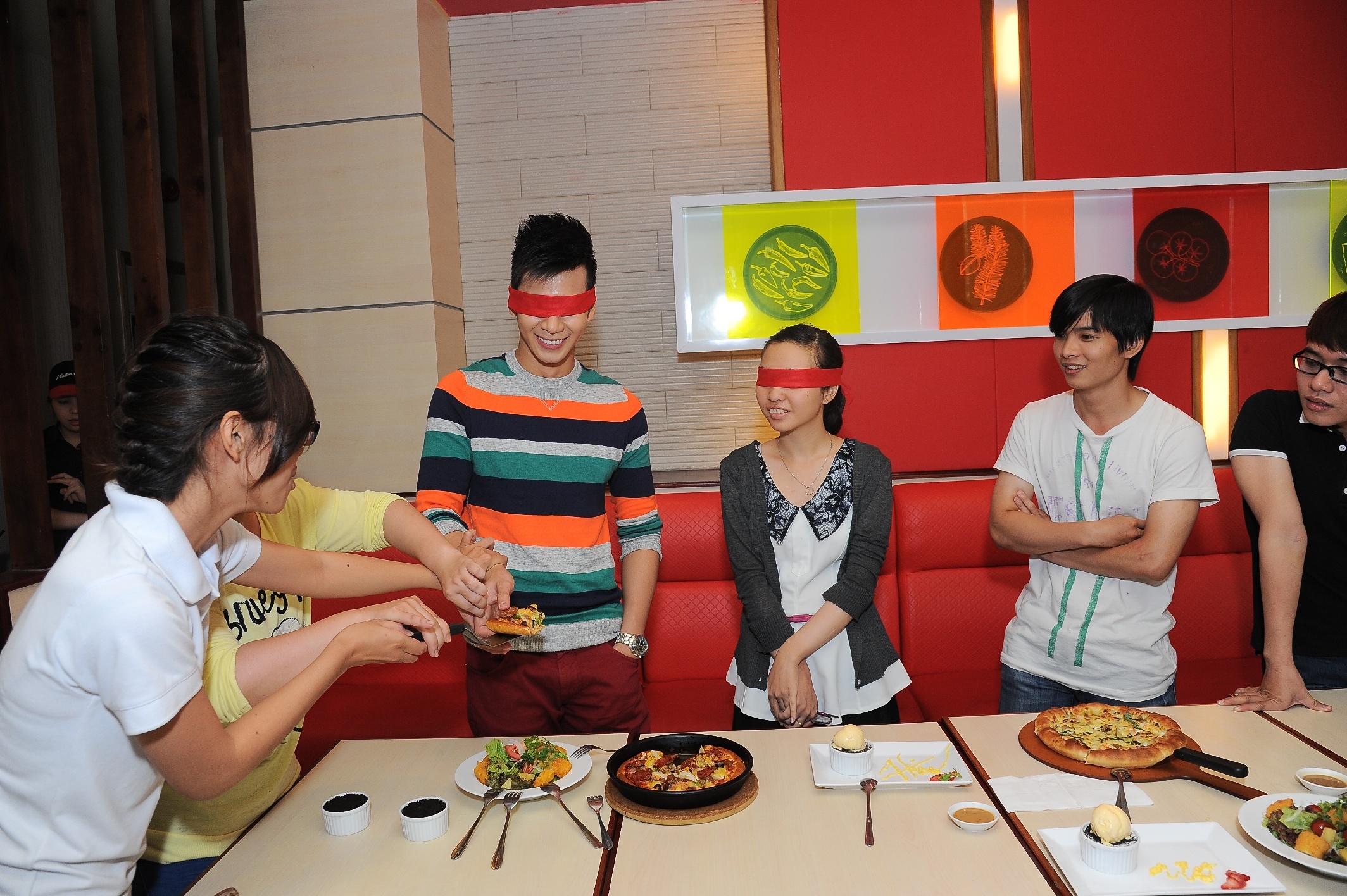 Một trong những điểm khiến Hồ Vĩnh Khoa thích nhất chính là được khám phá thực đơn mới của Pizza Hut theo cách rất đặc biệt. Đầu tiên, anh chàng được thử làm phục vụ 1 ngày tại nhà hàng Pizza Hut để gây bất ngờ. “Nhân viên không chuyên” Hồ Vĩnh Khoa khiến các vị khách rất thích thú.