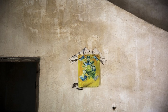 | Bức ảnh chụp phong bao lì xì màu vàng được dán trên tường như một lời nhắc nhở về những người từng sinh sống ở đây. |