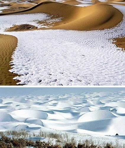 Sa mạc Taklamakan (Trung Quốc): Đây là sa mạc bao phủ bởi tuyết. Taklamakan là một trong những sa mạc lớn nhất thế giới. Sa mạc này bao phủ 337.600 km2 của khu vực Tarim Basin. Năm 2008, một trận tuyết rơi lớn kéo dài 11 ngày đã trùm lên sa mạc biến khu vực này thành một "thế giới tuyết trắng".