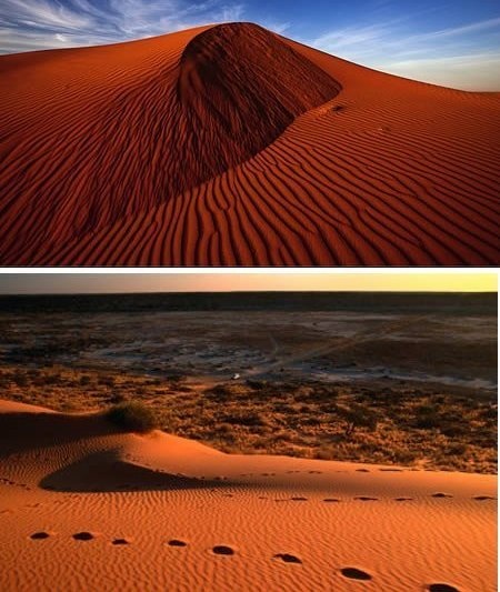 | Sa mạc : Australia là quê hương của 4 sa mạc lớn: Simpson, Tanami, Great Victoria và Sturt's Stoney. Trong đó, sa mạc Simpson được coi là "hòn đá đỏ khổng lồ" vì sự hiện diện của những cồn cát đỏ. Những cồn cát chạy theo hướng bắc nam ở trạng thái tĩnh và được giữ nguyên vị trí nhờ các loài thực vật. Chúng biến đổi độ cao từ 3 m ở phía bắc tới khoảng 30 m ở phía đông. |
