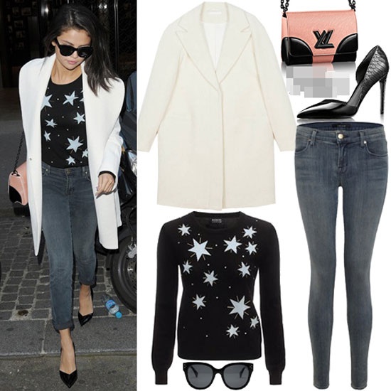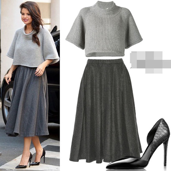 Bạn gái cũ của Justin Bieber tới NRJ Radio Station tại Paris trong phong cách điệu đà gồm váy xòe và áo crop top đều của hiệu CO. Tổng trị giá là 1.766 USD (khoảng 39 triệu đồng). Đôi giày của Louis Vuitton.