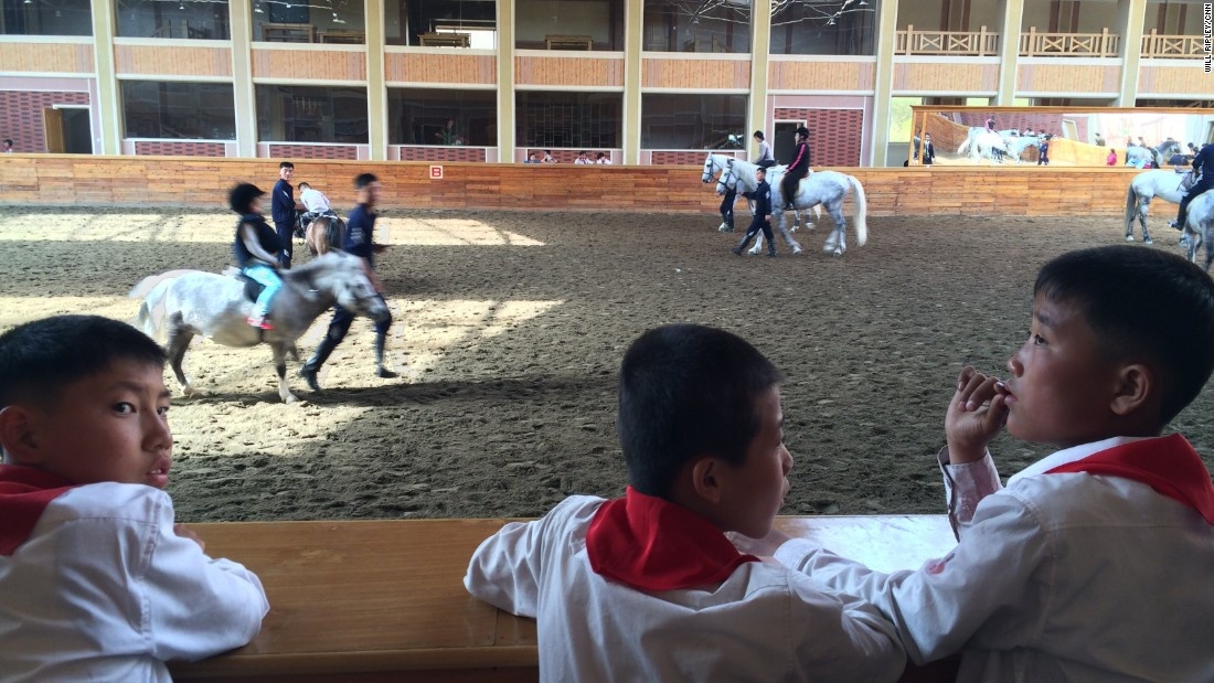 Học sinh theo dõi hoạt động cưỡi ngựa tại trường đua mới do nhà lãnh đạo Kim Jong Un thiết kế. Khu vực này trước đây từng là nơi huấn luyện quân sự. |