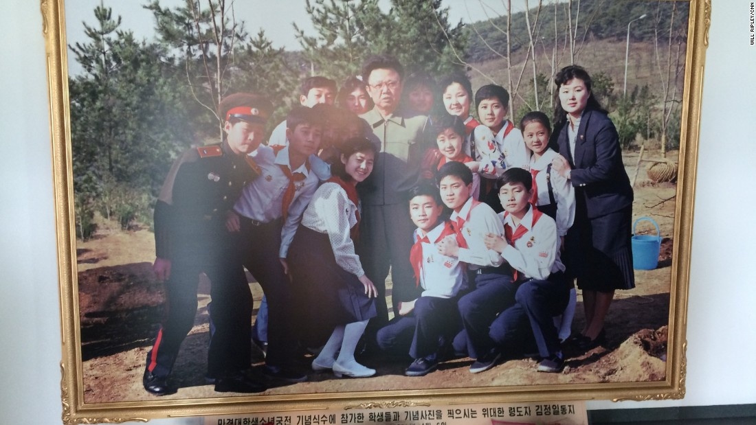 Một bức ảnh chụp cố lãnh đạo Kim Jong Il và các em học sinh được đặt tại hành lang của trường tiểu học Bình Nhưỡng. |