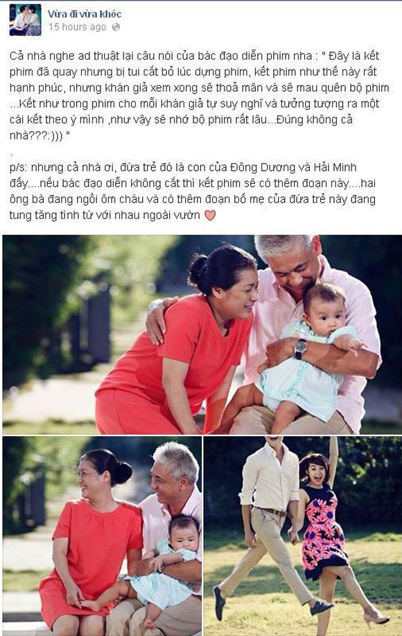 Tuy nhiên, theo chia sẻ của admin fanpage Vừa đi vừa khóc, đoạn kết ngọt ngào, hạnh phúc trên thực tế đã được quay nhưng khi dựng phim, chính Vũ Ngọc Đãng đã quyết định cắt "ending" đầy mãn nguyện này vì lo sợ khán giả quá thỏa mãn và sẽ mau quên bộ phim.