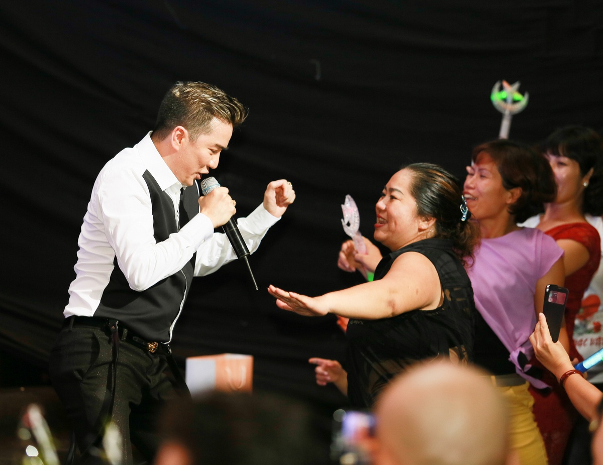 | Nhiều khán giả ở những độ tuổi khác nhau còn tiến đến sát sân khấu để nhảy theo những giai điệu do Mr. Đàm thể hiện. |
