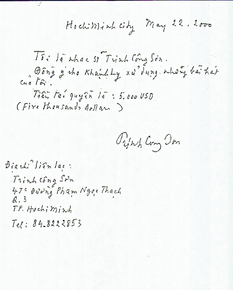 | Giấy Trịnh Công Sơn ký nhận tác quyền và cho phép Khánh Ly biểu diễn nhạc phẩm của ông. |