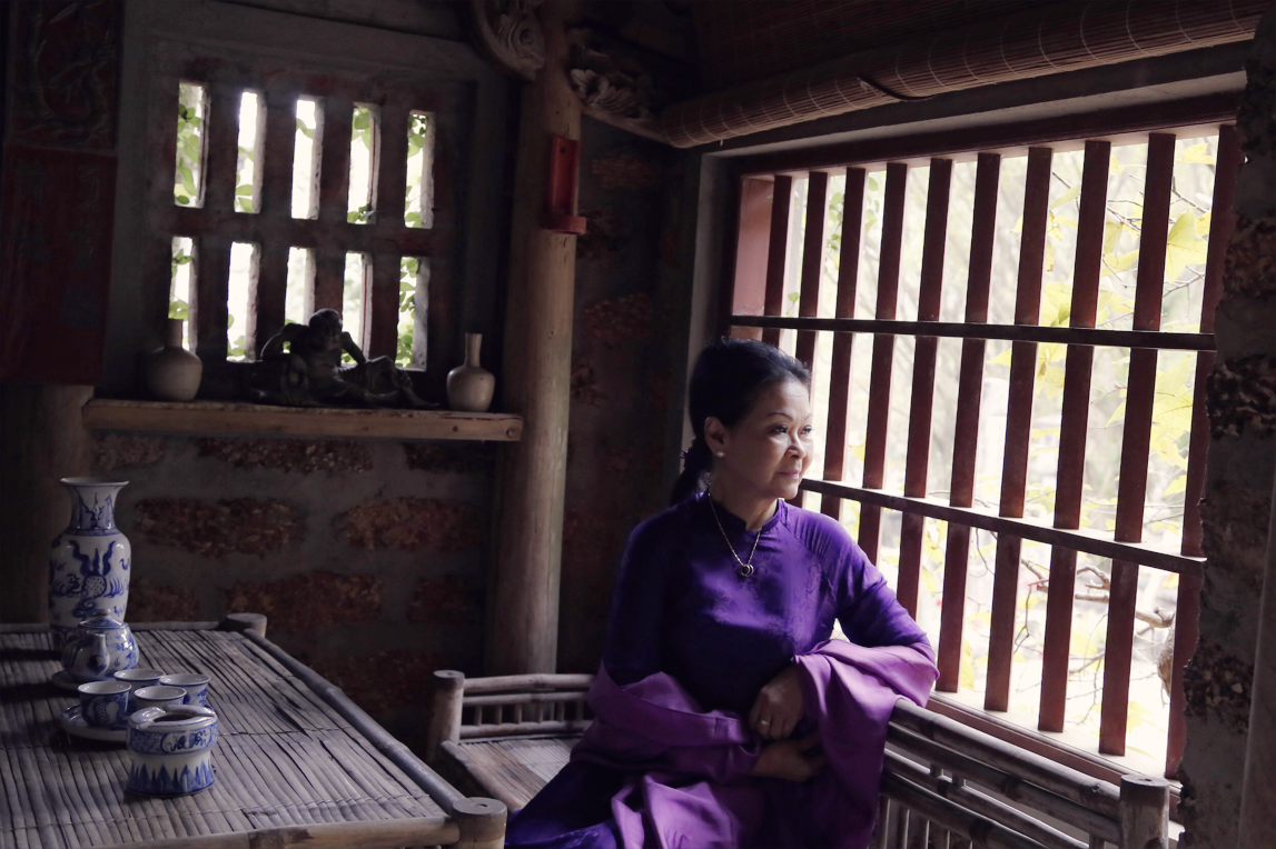 | Khánh Ly ngồi lặng lẽ tận hưởng không khí trong lành và yên tĩnh của Việt phủ. Trong lần ghé thăm này, nữ danh ca chọn áo dài tím rất hợp với không gian nơi đây. |