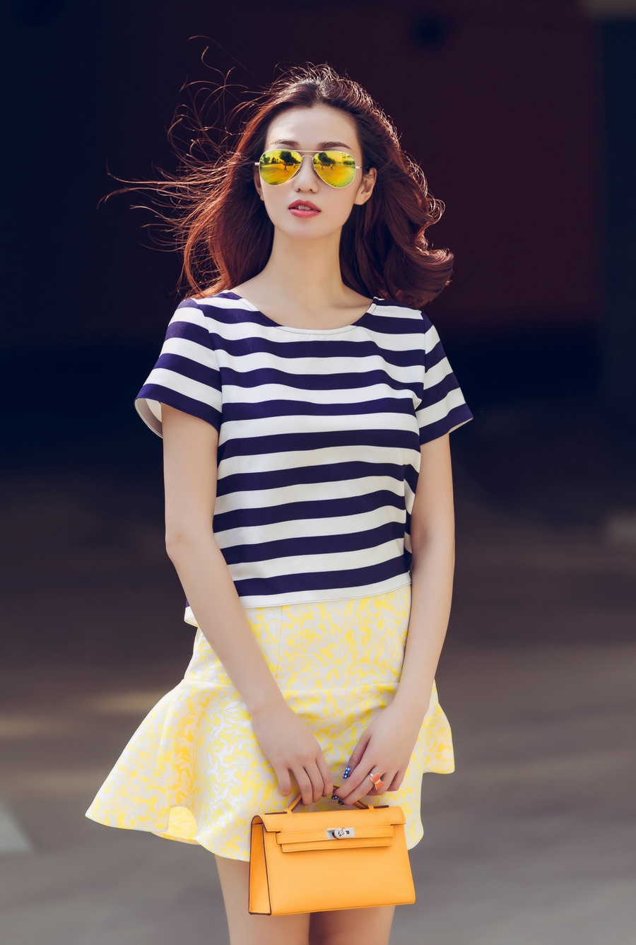 | Váy hạ eo họa tiết sọc kẻ rất hợp vóc dáng Khánh My. Phụ kiện túi Chanel, giày neon mix kèm làm điểm nhấn phong cách. Bộ ảnh được thực hiện bởi stylist: Travis Nguyễn, nhiếp ảnh: Chanh, trang điểm: Trần Anh Khoa, trang phục: Hà Tăng, LadyQ, Heverly. |