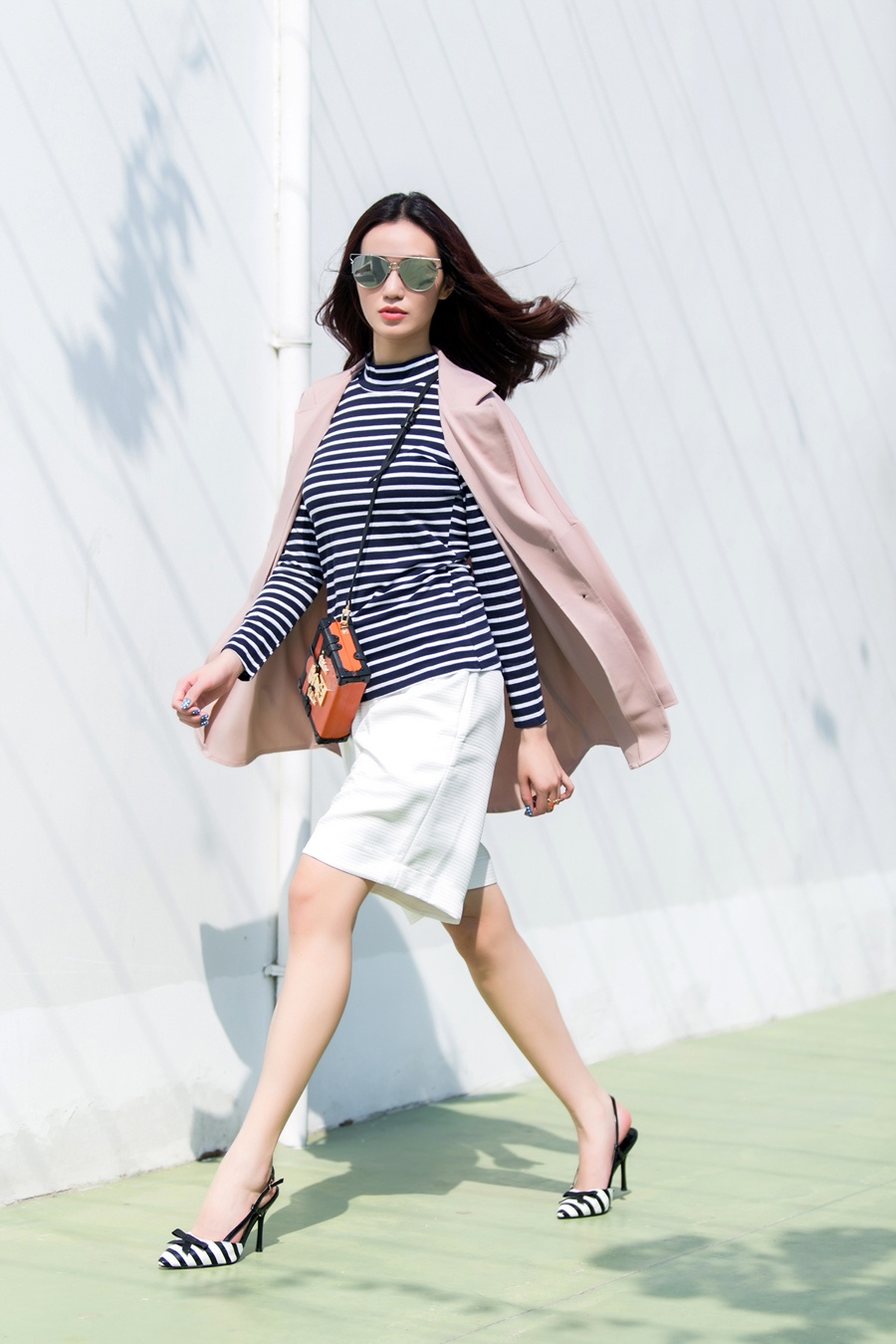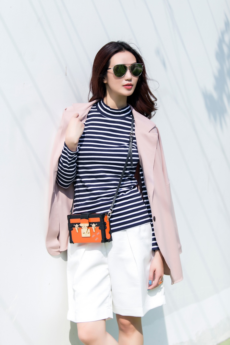 | Áo thun họa tiết sọc kẻ là một trong những items thời trang được người đẹp phim Váy hồng tầng 24 yêu thích. Cô phối hợp cùng chân váy xòe nhẹ nhàng, phụ kiện túi xách đồng màu ăn nhập tổng thể. |
