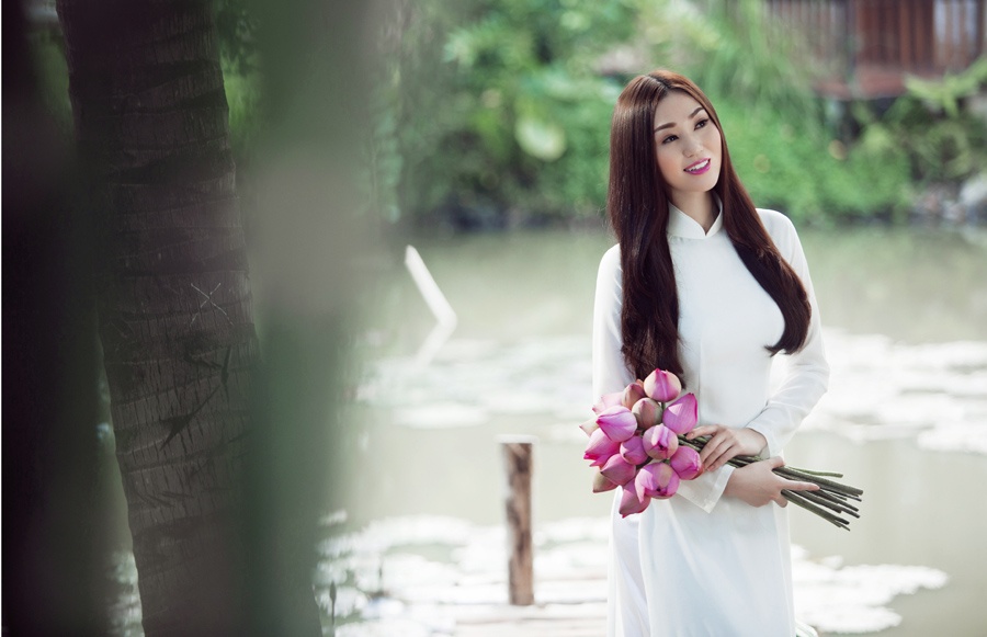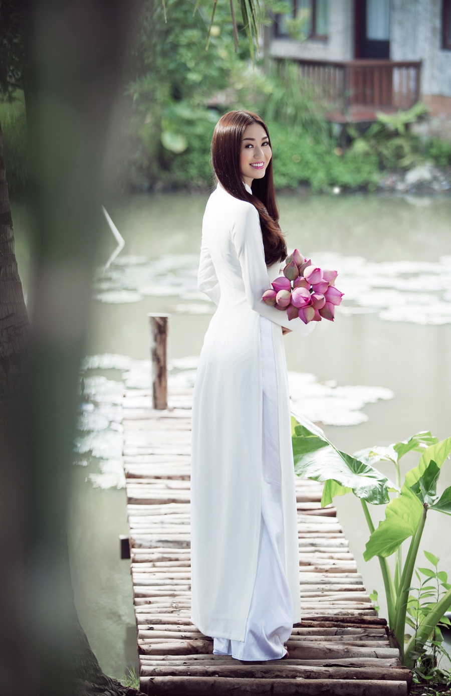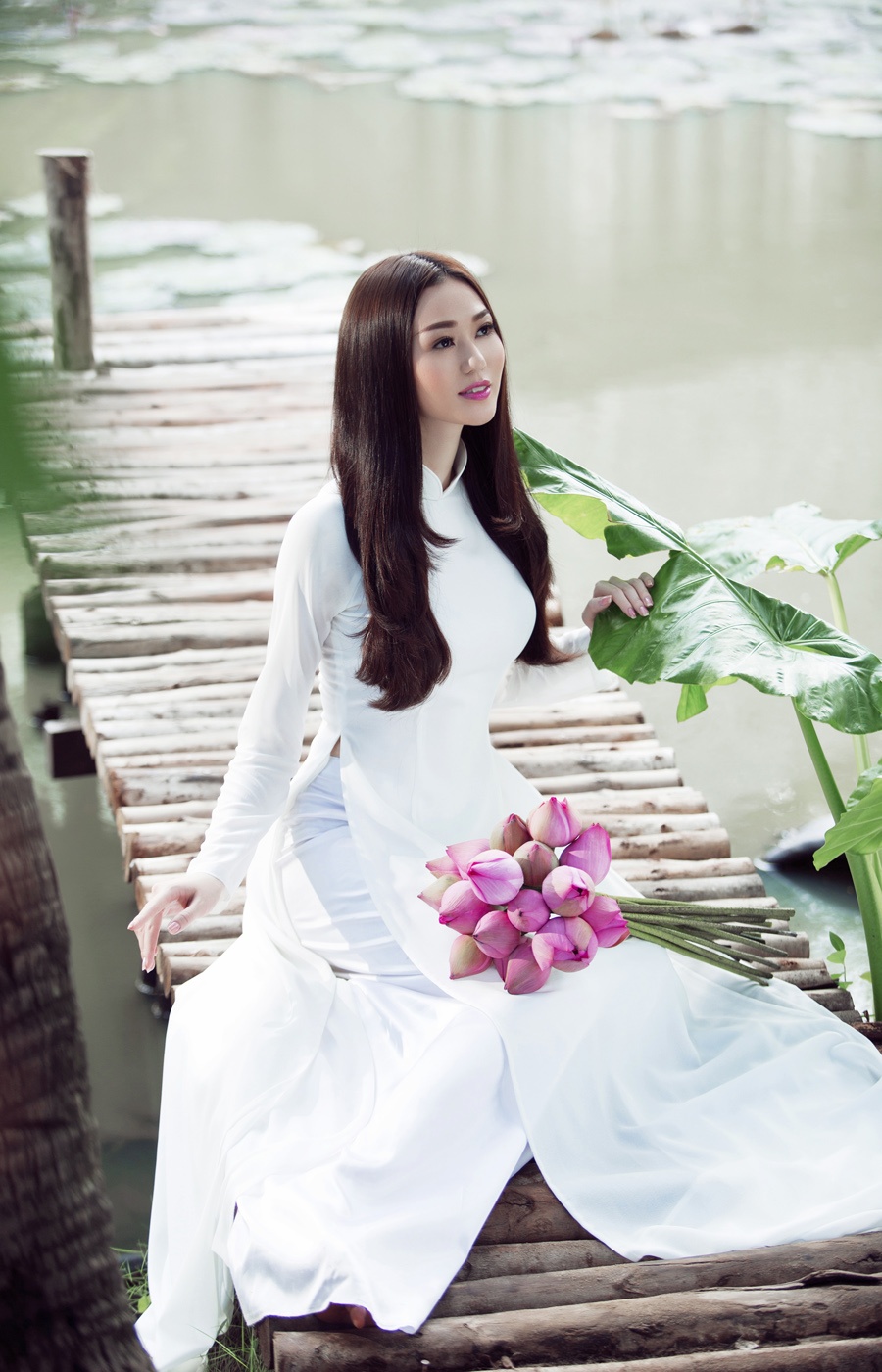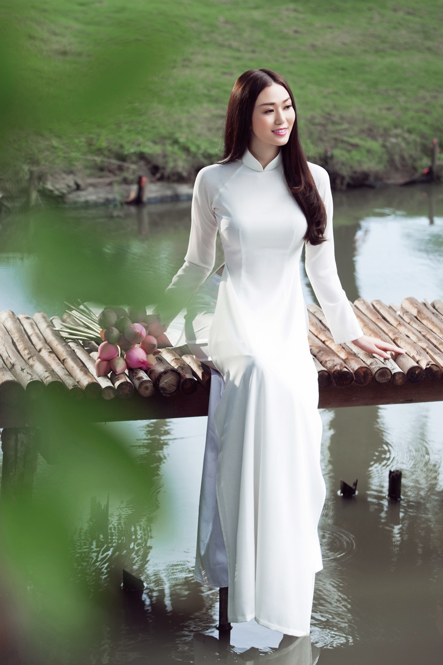 Nữ diễn viên Mỹ nhân Sài thành diện bộ áo dài trắng thực hiện bộ thời trang đậm nét truyền thống. Bối cảnh là bờ hồ lãng mạn ở khu vực xa thành phố.