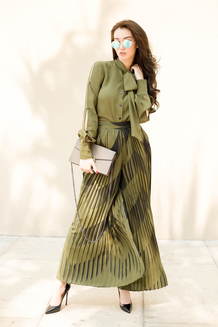 | Khánh My bắt nhịp xu hướng đang hot với chân váy xếp ly, áo sơ-mi thắt nơ điệu đà, gam màu xanh lục hợp xu hướng xuân hè 2016. |