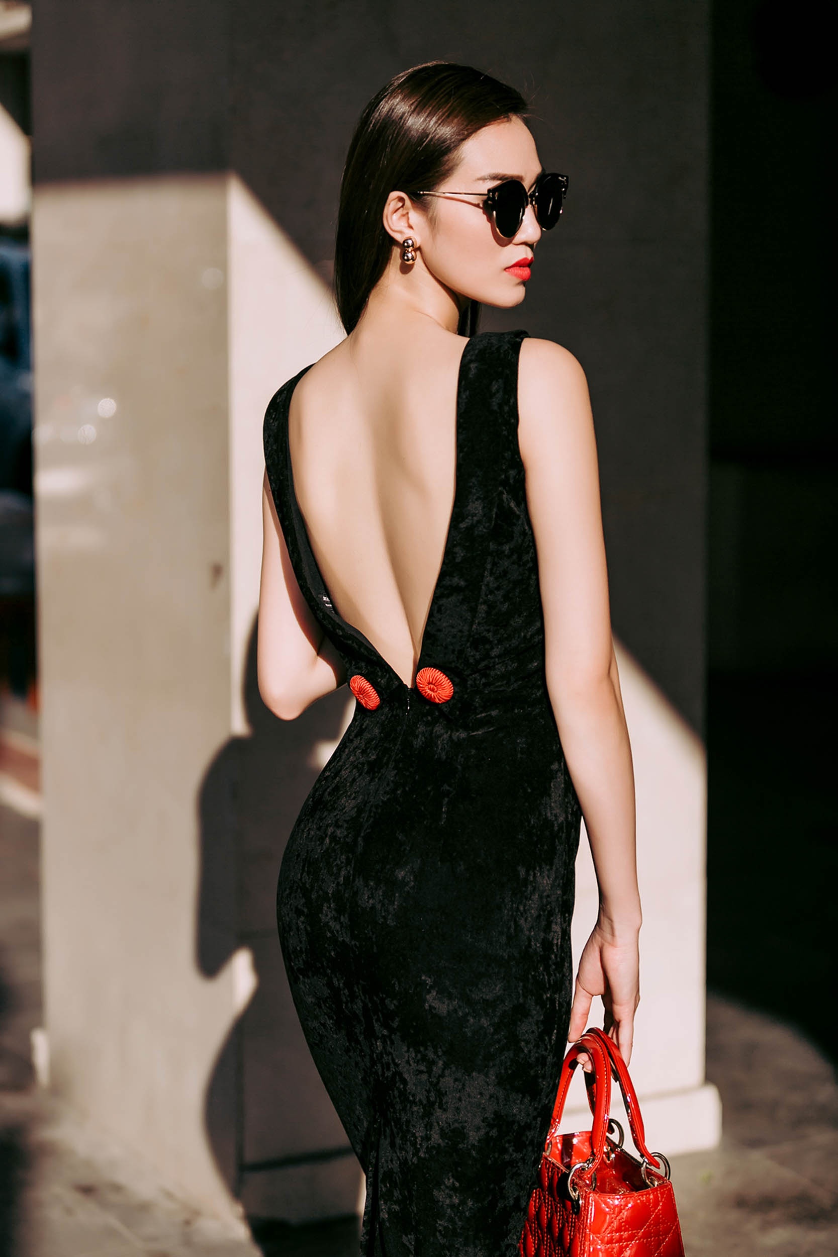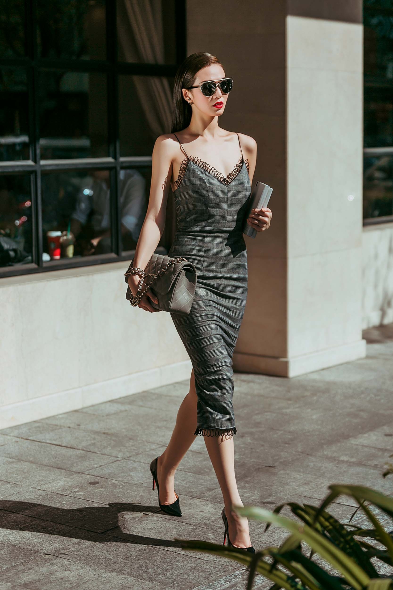 | Nữ diễn viên 9X nổi bật giữa góc phố Sài Gòn trong trang phục áo hai dây gợi cảm, ôm sát vóc dáng. |