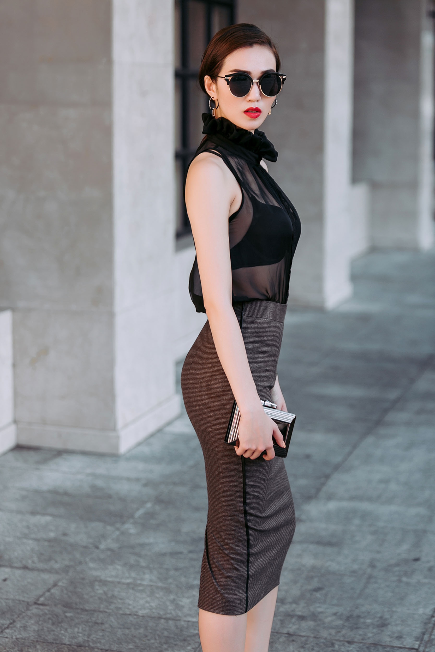 | Váy bút chì phom vải cứng cùng áo đen xuyên thấu, mái tóc ướt của thiệp niên trước ăn nhập phong cách. |