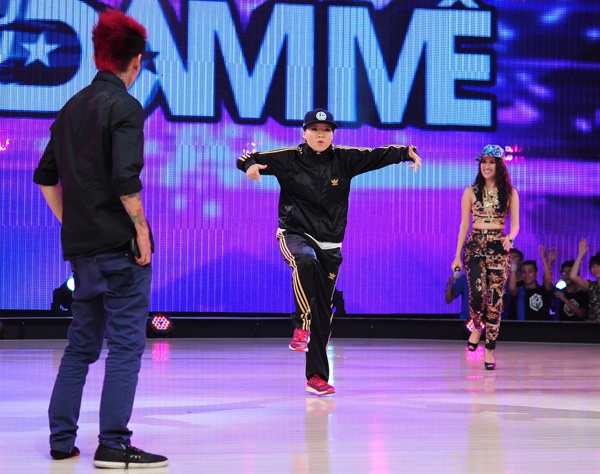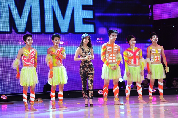 | Dumbo - giám khảo Việt kiều (ngoài cùng bên trái) không ít lần phải "bất đắc dĩ" lên sân khấu nhảy cùng thí sinh theo yêu cầu và sự năn nỉ của Khánh Thi. |