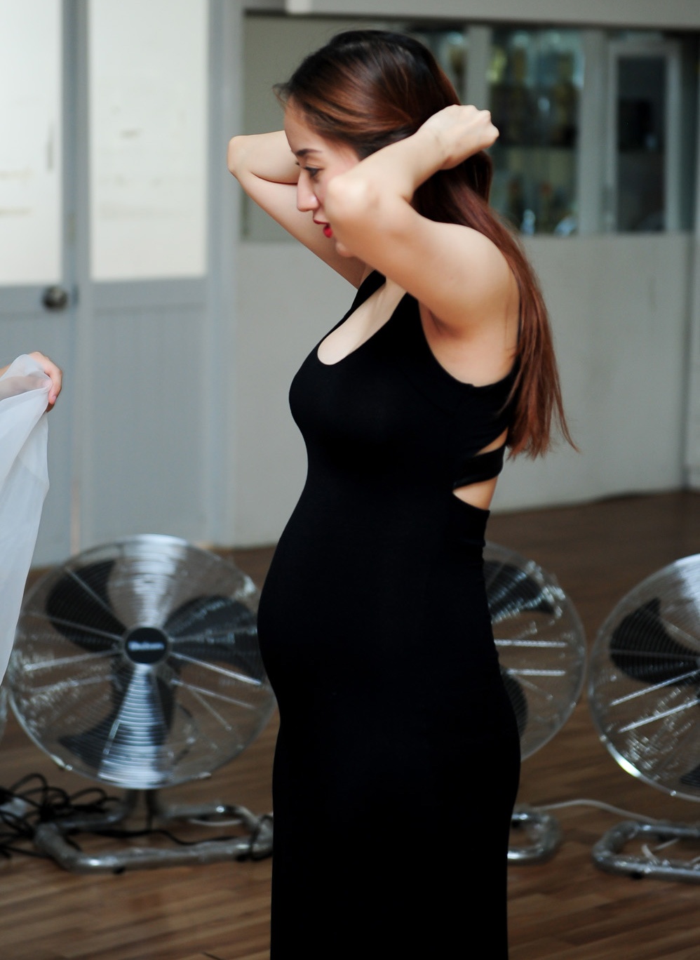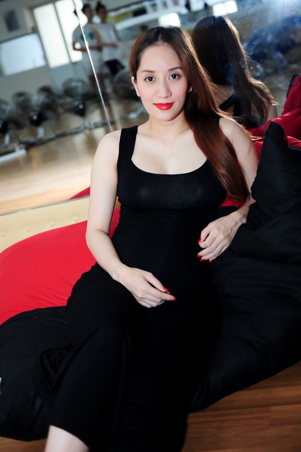 Sau khi hướng dẫn, gợi ý các động tác cho Chi Pu, bà bầu Khánh Thi tranh thủ nghỉ ngơi trong chốc lát.