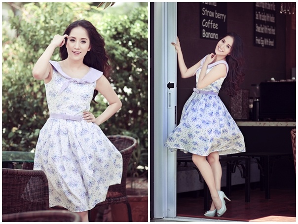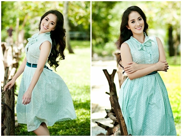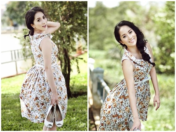Gam màu trầm nền nã phối hợp ăn ý cùng chất liệu váy cotton và họa tiết cổ điển. Kiểu váy những tưởng rất phù hợp với những cô gái đôi mươi lại dễ dàng phù hợp với Khánh Thi tạo cho người đẹp hình ảnh duyên dáng và thân thiện.