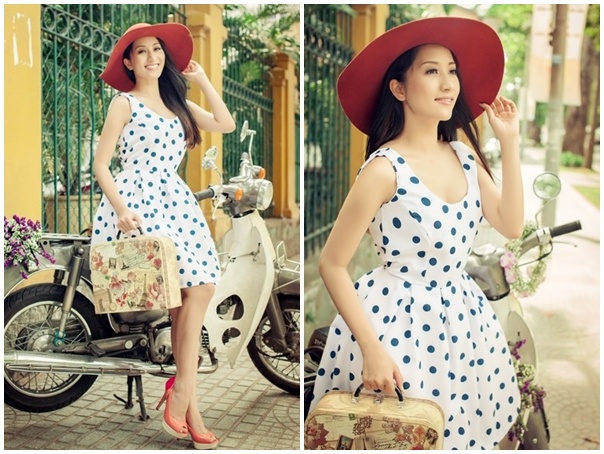 Họa tiết chấm bi cũng giúp cô trẻ hơn rất nhiều, kết hợp cùng giày màu hồng nhạt và mũ rộng vành duyên dáng, mái tóc được để suôn dịu dàng. Hình ảnh nữ tính, duyên dáng giúp Khánh Thi chiếm cảm tình của người hâm mộ.