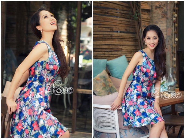 Vải in hoa sắc màu nổi bật góp phần tạo sự năng động và hiện đại cho dáng váy ngắn vừa phải. Kiểu váy thanh lịch và nữ tính tiếp tục được Khánh Thi sử dụng hiệu quả đem lại sự mềm mại, tươi tắn cho người mặc.