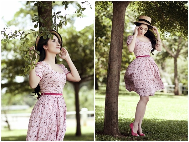 Gam màu nâu cổ điển được thiết kế trên dáng váy đơn giản, chất liệu đời thường cotton góp phần làm mới mẻ hình ảnh. Phối cùng giày màu hồng ngọt ngào và mũ cói vành nhỏ rất nữ tính. Nhờ hình ảnh tươi trẻ khá đời thường, Khánh Thi ghi điểm trong mắt người hâm mộ.
