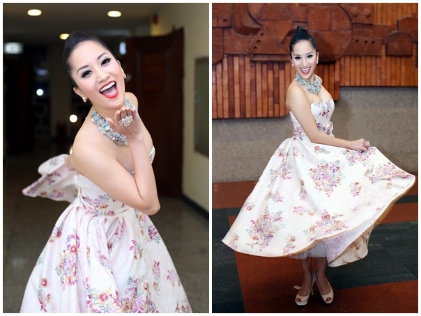 Dáng váy bồng xòe rộng liên tục được nữ giám khảo Bước nhảy hoàn vũ ứng dụng khi ngồi ghế nóng, cúp ngực ôm sát gợi cảm tăng sức trẻ trung cho người đẹp, phụ kiện vòng cổ phối hợp ăn ý.