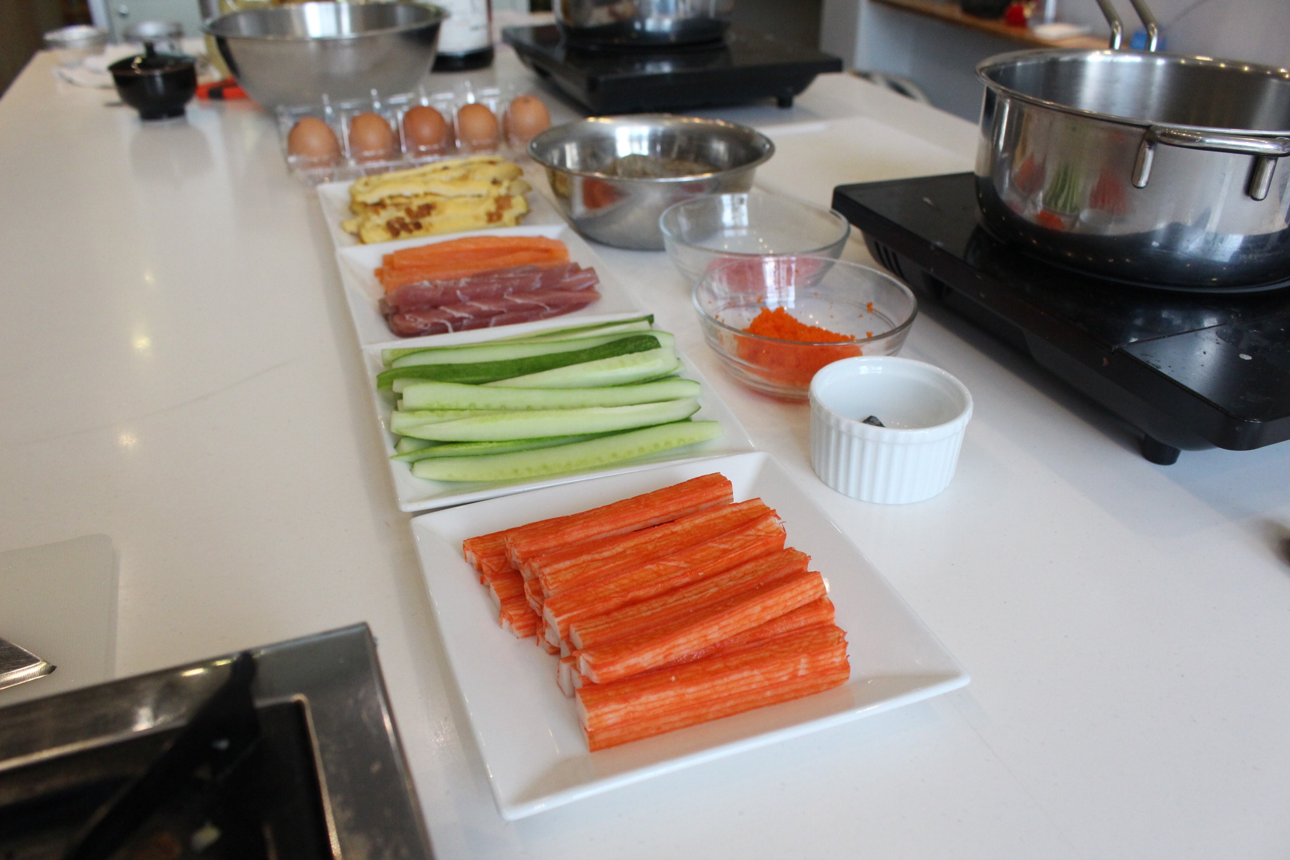 - Trải mành tre cuốn sishi trên mặt phẳng. Trải tiếp một miếng nilon mỏng. Dàn đều cơm lên nilon. Cho dưa leo, cà rốt, thanh cua... lên trên, cuốn lại. Không nên cho nhiều nhân, vì cuộn sushi sẽ rất lớn, mất ngon.