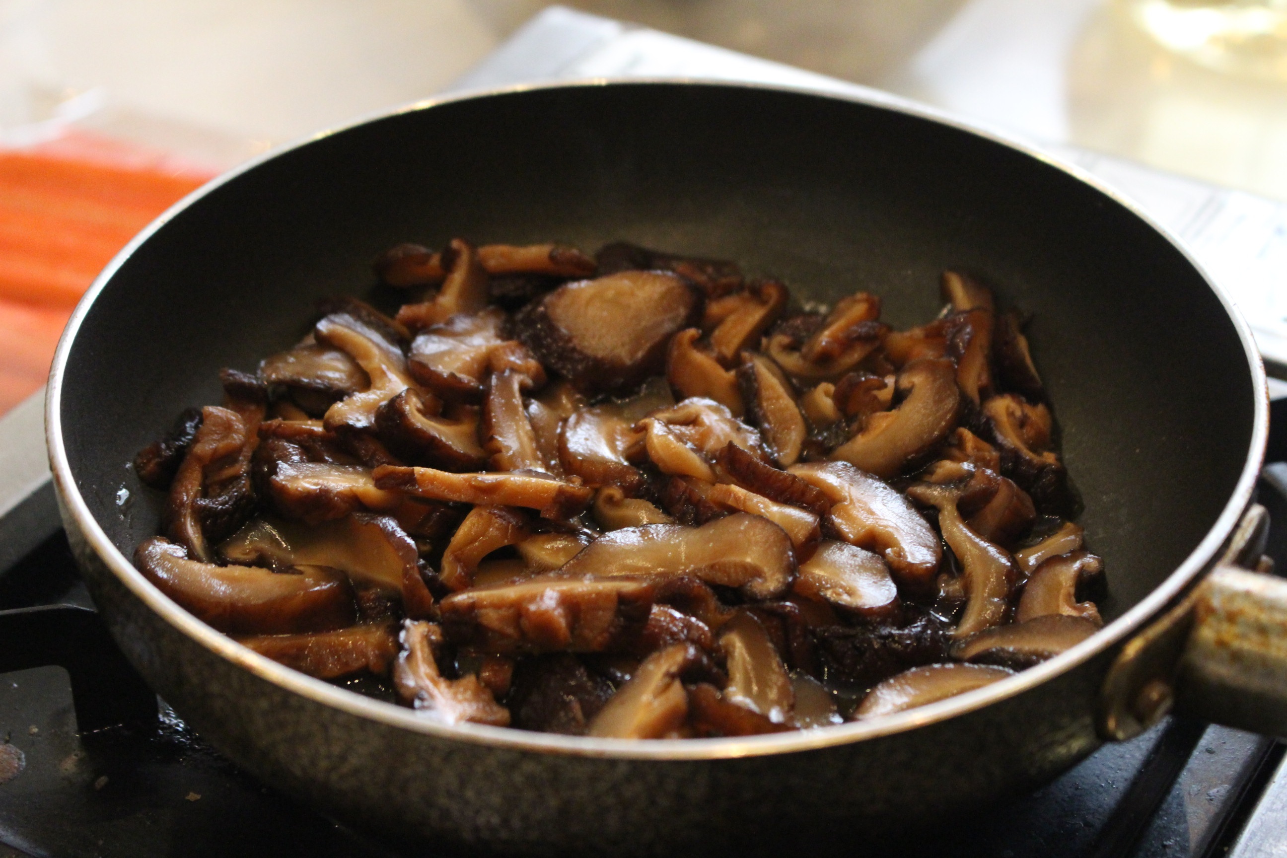- Xào nấm đông cô với ít dầu ăn, nước tương và rượu dùng để nấu ăn (mirin).