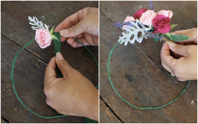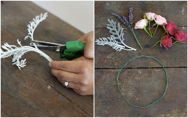 | Đầu tiên, cần có khoảng 2 bó hồng màu cánh sen và hồng nhạt (hoặc màu sắc khác tùy sở thích và hợp với trang phục của bạn), 1 bó nhỏ lá trang trí, 1 bó hoa oải hương (bạn có thể thay bằng hoa salem, baby, cúc nhỏ…), 1 cuộn băng dính màu xanh lá cây, 1 vòng kẽm vừa với khuôn đầu bạn và 1 chiếc kéo. |