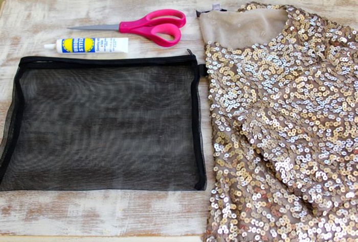 | Trước khi bắt tay may lấy chiếc clutch cho mình, bạn cần phải chuẩn bị đầy đủ các nguyên vật liệu sau: 1 chiếc túi lưới, 1 chiếc áo sequin cũ (hoặc bạn có thể mua vải sequin với màu sắc và kiểu sequin khác nhau theo ý thích cá nhân); 1 tuyp keo dán; kéo; 1 bàn chải bụi quần áo nhỏ; 1 miếng bìa cứng có kích thước bằng 1 mặt bên của túi lưới. |